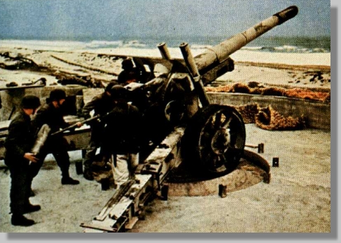 Pièce d'artillerie dans un "encuvement". Il est clair que des positions pareilles étaient extrêmement vulnérables aux attaques aériennes. Dès lors, les allemands vont protéger les pièces d'artilleries par des bunkers.