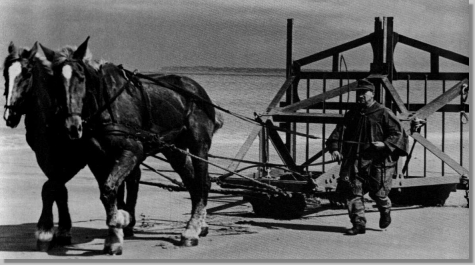 Un soldat mène 2 solides chevaux de trait qui tirent un obstacle en métal, dit "porte belge".