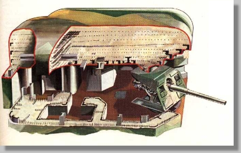 Marine. Vue en coupe d'un bunker pour pièce de 155 mm tel que l'on peut les visiter à